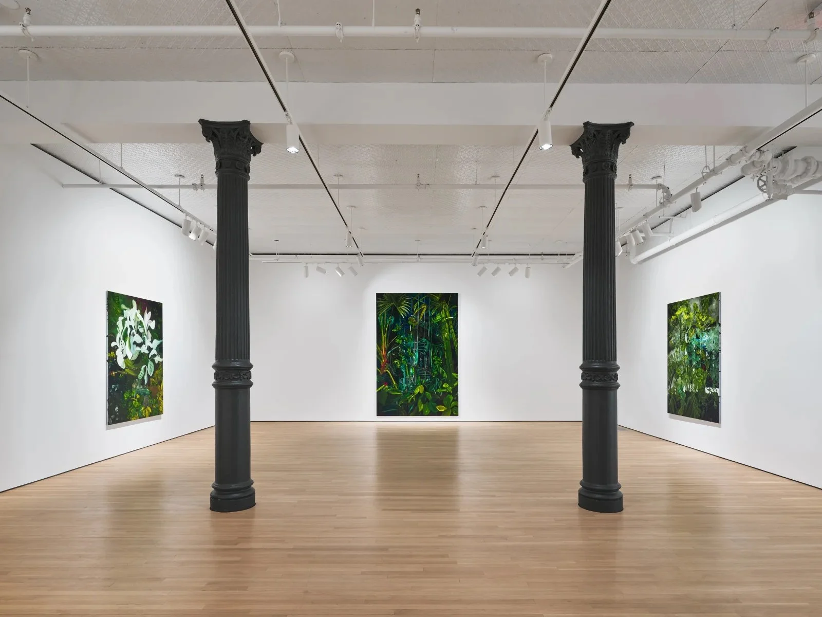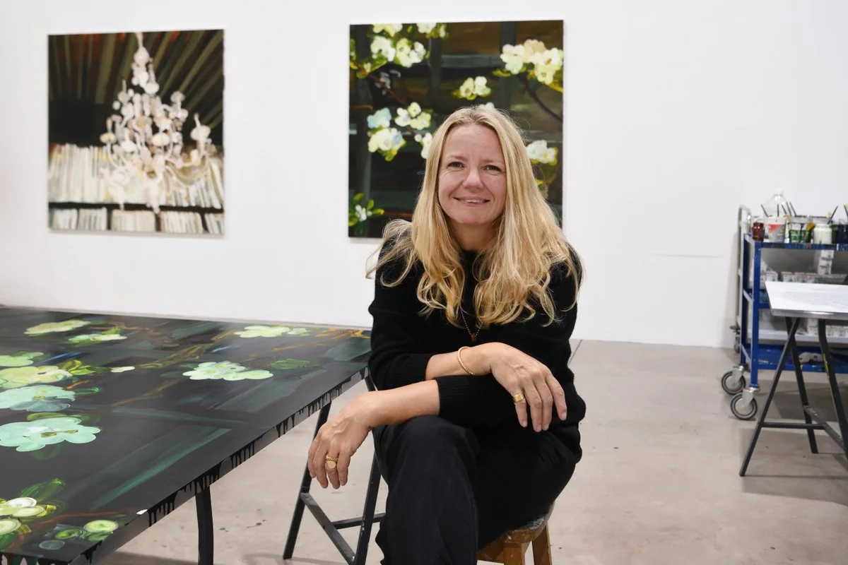 These touchpoints that anchor Woods' paintings also add to the timelessness of her still-life work. She herself notes, "Sometimes I don't really understand the paintings until maybe six months or a couple of years after and then… retrospectively looking back at work I made a couple of years ago, I can say, oh, yes, I really, really get that." Her painting Valley Forge (2024) stands apart for drawing inspiration from the past and present, while offering a nod towards an uncertain future. The painting depicts a futuristic blue glass dome enclosing flourishing gardens of greenery. While based on photographs from a trip to Los Angeles' Huntington Gardens, Woods said the painting also pulls inspiration from the 1972 sci-fi movie Silent Running. Glass is a constant motif across Woods' works; she remarked that when she was thinking about glass as it relates to gardens she's visited, she realized that "if glass wasn't there, they [the flowers] would be dead.… It's a filter and it's a boundary and that's what's been interesting about it in the work." As Woods explores the thin boundary between life and death, beauty and horror, she discovers and reflects the ephemeral nature of life.