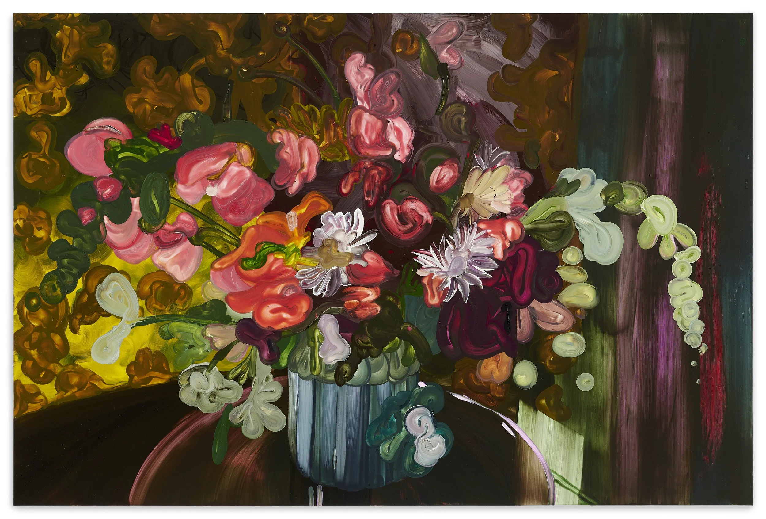 In her painting The Victory Garden, a large blue-green vase is overflowing with pink-hued flowers in various states of decay, wilting over the edges of the table. This foregrounded arrangement contrasts against a tonally darker background featuring thick, dark purple-hued vertical brushstrokes that hem in the light. The lack of certainty of what the flowers suggest adds to the richness of the painting—a temporary beauty marking a fated end. On this particular piece Woods herself notes that "there's always a sadness or a dark side. It's not just—there's a beautiful vase of flowers and I really want to paint them. It's like, oh, those dead flowers dropping with that purple velvet curtain behind looks really sinister or that reminds me of this grim feeling or that—there's always another side to this." This work along with several others can be seen in Woods’ exhibit “A Kinder Time” at the Stephen Friedman Gallery, marking her New York debut. Several of these paintings started during the pandemic when Woods was surrounded at home with these domestic objects.