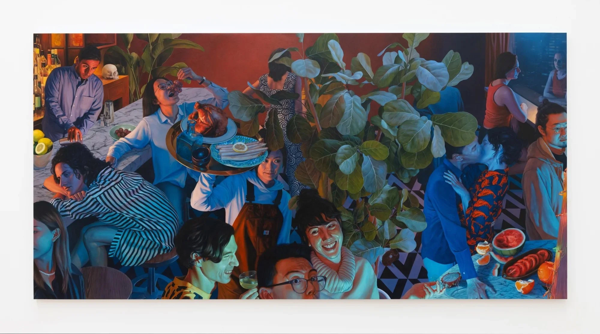 The scene, rich with color and detail, initially presents itself as a typical social gathering: there’s an intimate moment between a couple, lively conversation at a table, and sumptuous food scattered across the space. Yet beneath this seemingly familiar setting lies an intricate composition that blurs boundaries between the real and the imaginary, between life and death, and between what is seen and what is unseen.